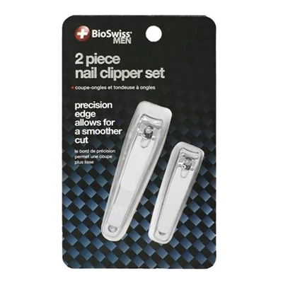 BioSwiss Men 2 Piece Nail Clipper Set Use the Bioswiss Men Nail Clipper set to keep your hands and feet perfectly manicured. Sharp steel blades make it easy to cut nails and leave a smooth edge every time. Use the large clipper on toenails and small clipper for fingernails. Small clipper is perfect for your dopp kit or toiletry bag.