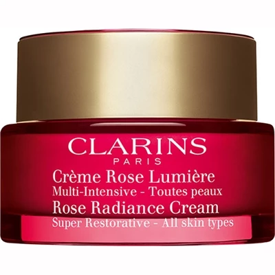 Clarins Super Restorative Rose Radiance Cream All Skin Types 1.7oz / 50ml This vibrant pinktinted, antiaging cream is infused with radianceboosting hibiscus sabdariffa flower acids and dark spottargeting vitamin C for skin that glows with renewed vitality and the look of youth. The hibiscus sabdariffa flower acids gently remove dead surface cells to leave skin smooth, supple and visibly tightened, allowing light to better reflect on the skins surface for maximum rosiness and radiance. The brands Universal Radiance Complex contains four shades of motherofpearl that amplify white light, boosting skins luminosity and blurring imperfections for a virtually flawless complexion. Organic harungana extract replenishes to visibly restore the look of skins density, elasticity and healthylooking vitality. It features a fruityfloral essence of peach, peony and rose.