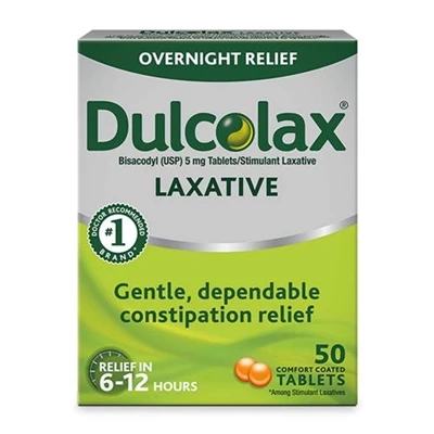 Dulcolax Laxative Overnight Relief 50 Comfort Coated Tablets Wake up to dependable constipation relief with Dulcolax Stimulant Laxative comfort coated tablets. Made with active ingredient bisacodyl, Dulcolax Stimulant Laxative gently stimulates the intestines to encourage a morning bowel movement. A single dose gives you relief from hard, dry stools in 612 hours.