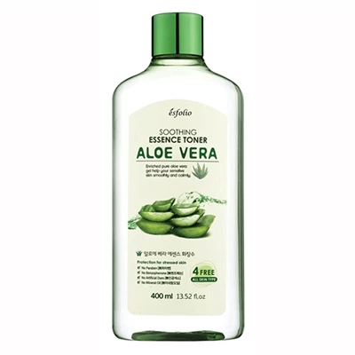 Esfolio Soothing Essence Toner Aloe Vera 13.52oz / 400ml Developed to balance out your skins natural pH level; removes excess dirt, stubborn makeup residue, and other impurities; calms and soothes sensitive or acneprone skin; free of parabens, artificial dyes, and mineral oil