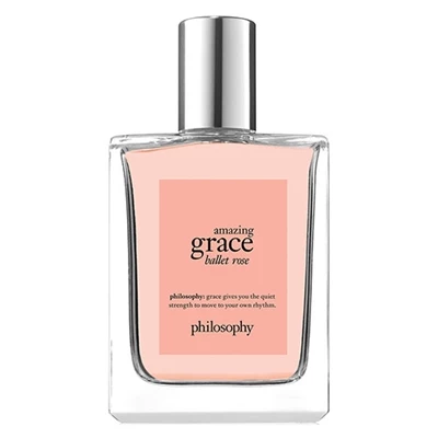 Philosophy Amazing Grace Ballet Rose for Women 4oz Eau De Toilette Spray Amazing Grace Ballet Rose Eau de Toilette is inspired by the delicate scent of pink rose petals opening at first bloom, and the beautiful femininity of Philosophys bestselling Amazing Grace fragrance. This captivating scent captures the quiet strength of a ballerina in a heart of delicate rose and peony, layered with sparkling lychee, and finished with woods and sheer ballet pink musk.