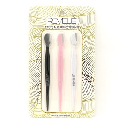 Revele 3 Bikini Eyebrow Razors Perfect touch up tool for expertly groomed eyebrows. Can also be used to painlessly remove unwanted hair on your face or bikini area. Includes safety cover and ridged guard that protects delicate skin and prolongs blade sharpness.