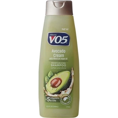 VO5 Avocado Cream With Moroccan Argan Oil Shampoo 12.5oz / 370ml With Moroccan argan oil. Soften and shine. + 5 vitamins  oils. Paraben free. Silicone free. New. Vitamin E. Vitamin H. Vitamin C. Vitamin B5. Vitamin B3. Sunflower oil. Almond oil. Mango oil. Chamomile oil. Rosemary oil. Alberto VO5 has a unique formula that leaves hair looking vibrant and beautiful. Thats the secret of VO5!