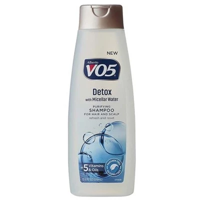 VO5 Detox With Micellar Water Shampoo 12.5oz / 370ml Purifying shampoo for hair and scalp. Refresh and reset. +5 vitamins  oils. Paraben free. Silicone free. New. Vitamin E. Biotin. Vitamin C. Vitamin B5. Vitamin B3. Sunflower oil. Almond oil. Mango oil. Chamomile oil. Rosemary oil. Alberto VO5 has a unique formula that leaves hair looking vibrant and beautiful.