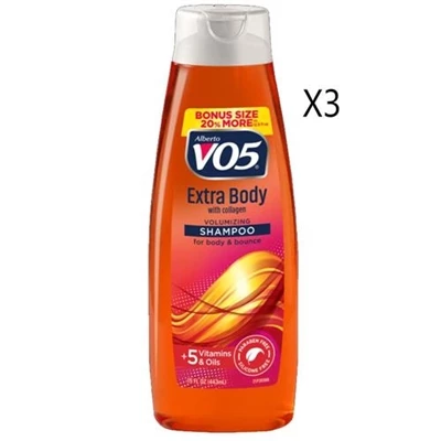 VO5 Extra Body With Collagen Shampoo 3 Packs Collagen works to enhance and create the vibrant bounce that you want for your hair. Leaves a clean scent as you volumize your hair from root to tip and shiny and strong hair. Alberto VO5 has a unique formula that leaves hair looking vibrant and beautiful and a perfect choice to be made on.